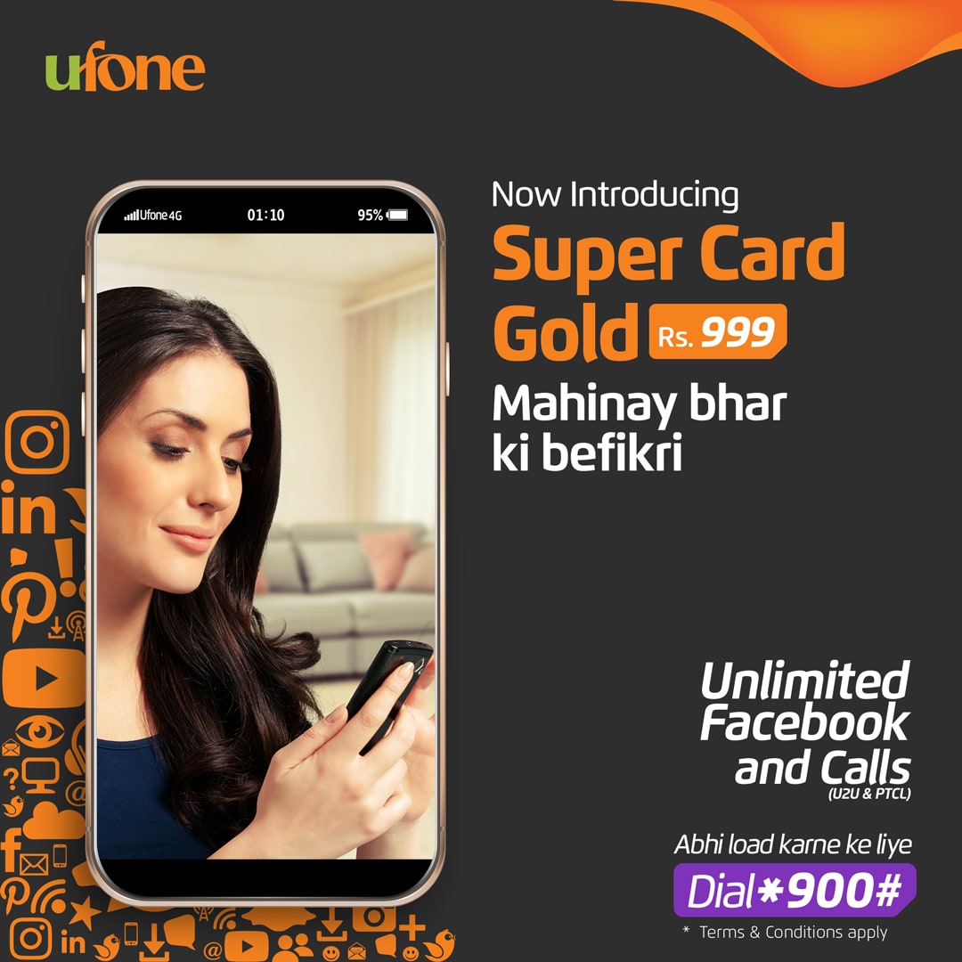 The new addition to the Super Card family will facilitate the ones with greater connectivity needs. Super Card Gold offers 24 GB data including 7GB for Facebook, unlimited U-U & U-PTCL Unlimited*, SMS Unlimited* and 600 off-net min The card will be valid for 30 days and can be activated by self-service channels i.e. dialling *900#, digital mediums i.e. my Ufone app, www.ufone.com via credit & debit card and online partners. Upon subscribing via credit & debit card via my Ufone app and Ufone websites, customers can avail 10% cash back as well.